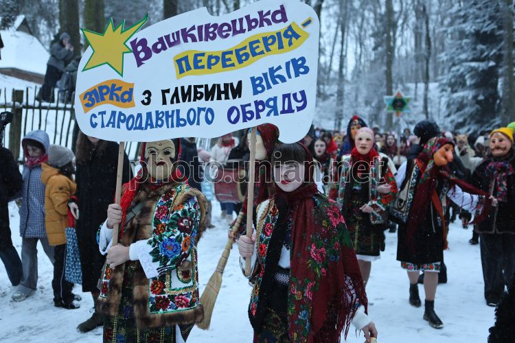 Народний обряд «Вашківецька Переберія» (Буковинська Маланка) в Музеї народної архітектури та побуту імені Климентія Шептицького (скансен «Шевченківський гай») у Львові, 28 грудня 2025 р. До Львівського скансену «Шевченківський Гай» з народним обрядом «Вашківецька Переберія» приїхали гості з Буковини. Напередодні презентації буковинської Переберії в Гаю, відбулися майстер-класи з створення одного з головних традиційних атрибутів Маланки – маски. Уроки провели буковинці Лідія та Василь Столяри з Вашківців — носії живої традиції, які за понад 15 років виготовили вже більш ніж тисячу масок для України та світу. Вашківецька Переберія — традиційне карнавальне дійство, яке відбувається у м. Вашківцях Вижницького району Чернівецької області 13-14 січня. Фото Кравс Євгеній / УНІАН