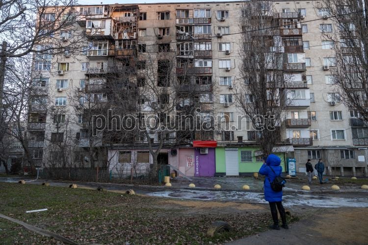 Частково зруйнований фасад та вибиті вікна у багатоповерховому будинку внаслідок масованого обстрілу Одеси російськими дронами, 31 грудня 2025 р. Російська армія в ніч проти 31 грудня атакувала Одесу ударними дронами. Пошкоджені житлові багатоповерхівки, є постраждалі. У частині міста відсутнє електропостачання, немає водо- та теплопостачання. Фото Гіманов Олександр / УНІАН