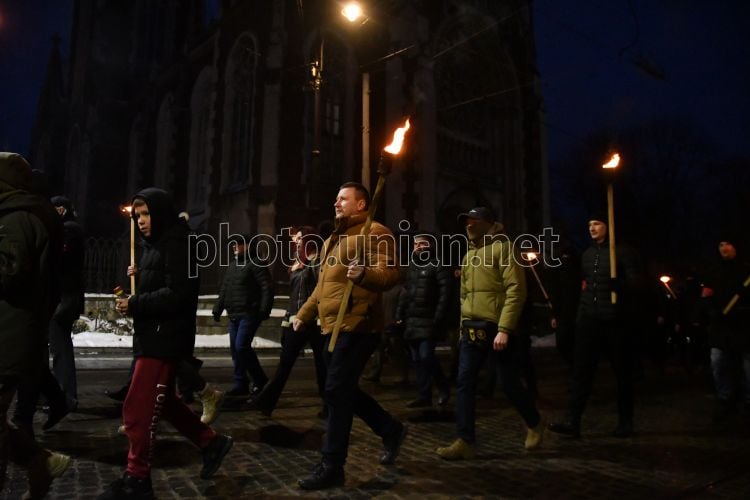 Факельна хода з нагоди 117 річниці з дня народження провідника Організації українських націоналістів Степана Бандери у Львові, 1 січня 2026 р. Цього дня у Львові відбулася смолоскипна хода з нагоди дня народження Степана Бандери. Учасники заходу вирушили від пам’ятника провіднику ОУН до проспекту Свободи і пам’ятника Шевченкові. Їхня хода супроводжувалася патріотичними гаслами і запаленими фаєрами. У ході взяли участь молодь, представники патріотичних громадських організацій, політики. Фото Тис Микола / УНІАН