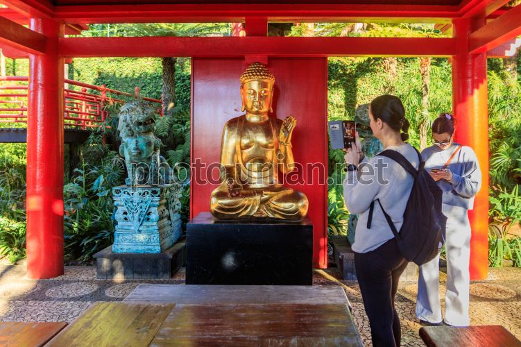 Туристки біля позолоченої статуї Будди на території Південного Японського саду в тропічному саду Монте-Палацу на вершині гори Монте в місті Фуншал острова Мадейра (Португалія), 8 січня 2026 р. Фото Немеш Янош / УНІАН