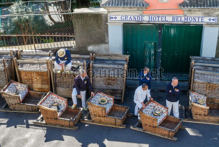 "Саночники" чекають на туристів аби спустити їх по асфальту у плетених корзинах (санях) з пагорба Монте до Лівраменто (район м. Фуншала), на острові Мадейра (Португалія), 8 січня 2026 р. Фото Немеш Янош / УНІАН