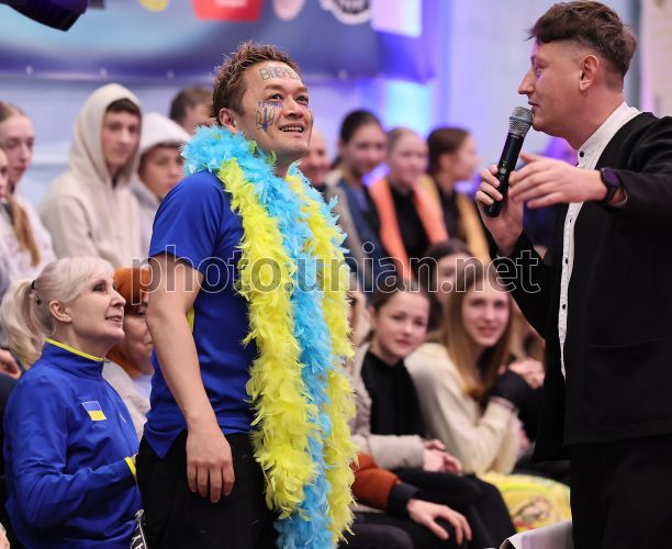 Фанат української легкоатлетки, олімпійської чемпіонки, рекордсменка світу з легкої атлетики Ярослави Магучіх Ацуші Канаока під час турніру XXVII Меморіал Олексія Дем’янюка у Львові, 17 січня 2026 р. У залі за змаганнями спостерігав екстравагантний фанат із розмальованим в жовто-блакитні кольори обличчям. До України на Меморіал Дем'янюка аж з Японії вирішив дістатися Ацуші Канаока – палкий шанувальник української легкоатлетки, олімпійської чемпіонки, рекордсменка світу з легкої атлетики Ярослави Магучіх. Японець зізнався, що не пропускає змагань за участі нашої спортсменки. Традиційний сувенір-подарунок для "принцеси Ясі" – корона. Фото Кравс Євгеній / УНІАН