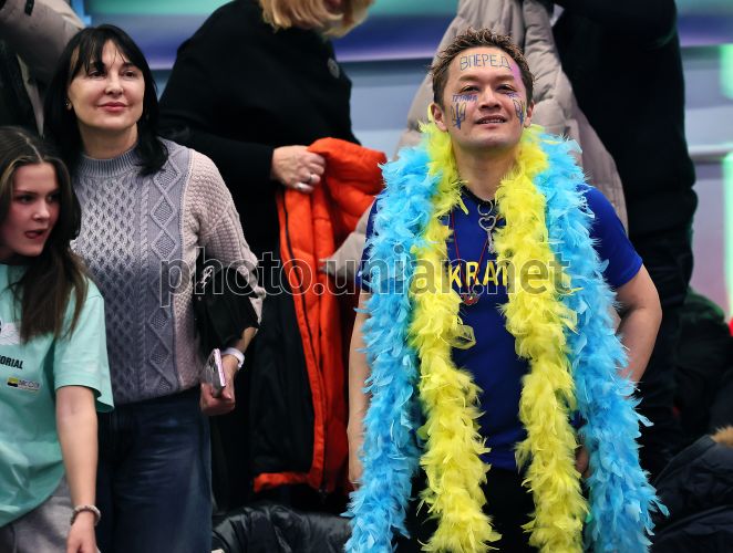 Фанат української легкоатлетки, олімпійської чемпіонки, рекордсменка світу з легкої атлетики Ярослави Магучіх Ацуші Канаока під час турніру XXVII Меморіал Олексія Дем’янюка у Львові, 17 січня 2026 р. У залі за змаганнями спостерігав екстравагантний фанат із розмальованим в жовто-блакитні кольори обличчям. До України на Меморіал Дем'янюка аж з Японії вирішив дістатися Ацуші Канаока – палкий шанувальник української легкоатлетки, олімпійської чемпіонки, рекордсменка світу з легкої атлетики Ярослави Магучіх. Японець зізнався, що не пропускає змагань за участі нашої спортсменки. Традиційний сувенір-подарунок для "принцеси Ясі" – корона. Фото Кравс Євгеній / УНІАН