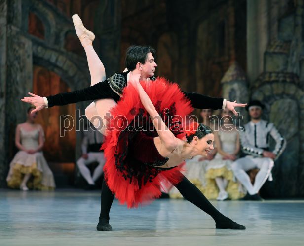 Заслужені артисти України Ярина Котис (Кітрі) та Олександр Омельченко (Базіль) під час балету «Дон Кіхот» у Львівській національній опері, 8 лютого 2026 р. Фото Кравс Євгеній / УНІАН
