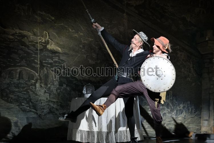 Артист Юрій Григорьєв (Дон Кіхот) і в ролі Санчо Панса деб’ютував Олег Ласка під час балету «Дон Кіхот» у Львівській національній опері, 8 лютого 2026 р. Фото Кравс Євгеній / УНІАН