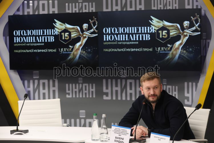Заступник головного виконавчого директора зі стратегічних маркетингових комунікацій та проектів МХП Валерій Бондарь під час церемонії оголошення імен номінантів 15-ї ювілейної Національної музичної премії YUNA 2026, у пресцентрі інформаційного агентства УНІАН в Києві, 10 лютого 2026 р. Під час трансляції церемонії організатори також розповіли про зміни в регламенті премії, нову номінацію "Найкраща нова версія" та специфіку нинішнього сезону YUNA, який є 15-м, ювілейним. Фото Ковальчук Віктор / УНІАН