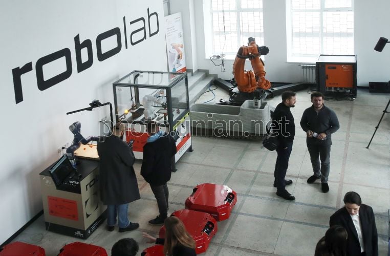 Перша в Україні лабораторії робототехніки RoboLab в Києві, 12 лютого 2027 р. Першу в Україні лабораторію робототехніки RoboLab відкрили на базі Київського національного університету будівництва та архітектури (КНУБА). Простір орієнтований на створення роботів, 3D-моделювання та роботу з ШІ. Проєкт реалізується за ініціативи Мінцифри та Асоціації робототехніки для розвитку інженерних рішень. Фото Синиця Олександр / УНІАН