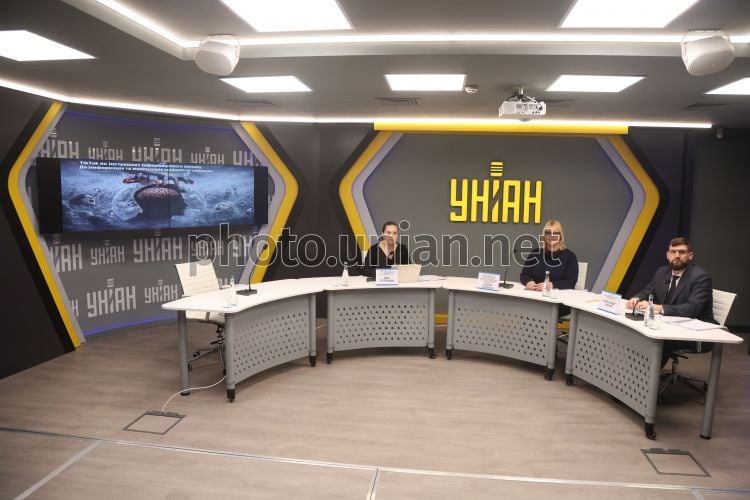 Директорка Інституту стратегічних досліджень та безпеки імені Павла Лисянського Віра Ястребова, доктор політичних наук, заступник директора Інституту політичних і етнонаціональних досліджень ім. І.Ф. Кураса НАН України, член-кореспондент НАН України Галина Зеленько, директор дослідницької компанії "Актив-груп" Олександр Позній під час презентації аналітичного звіту «TikTok як інструмент інформаційного впливу. Дезінформація та маніпуляція свідомістю громадян», в інформаційному агентстві УНІАН, в Києві, 19 лютого 2026 р. У пресцентрі УНІАН відбулася презентація аналітичного звіту, підготовленого Інститутом стратегічних досліджень та безпеки імені Павла Лисянського. Дослідження присвячене аналізу використання платформи TikTok як інструменту когнітивного та інформаційно-психологічного впливу в умовах повномасштабної війни проти України. Фото Ковальчук Віктор / УНІАН
