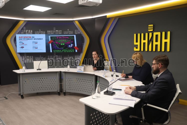 Директорка Інституту стратегічних досліджень та безпеки імені Павла Лисянського Віра Ястребова, доктор політичних наук, заступник директора Інституту політичних і етнонаціональних досліджень ім. І.Ф. Кураса НАН України, член-кореспондент НАН України Галина Зеленько, директор дослідницької компанії "Актив-груп" Олександр Позній під час презентації аналітичного звіту «TikTok як інструмент інформаційного впливу. Дезінформація та маніпуляція свідомістю громадян», в інформаційному агентстві УНІАН, в Києві, 19 лютого 2026 р. У пресцентрі УНІАН відбулася презентація аналітичного звіту, підготовленого Інститутом стратегічних досліджень та безпеки імені Павла Лисянського. Дослідження присвячене аналізу використання платформи TikTok як інструменту когнітивного та інформаційно-психологічного впливу в умовах повномасштабної війни проти України. Фото Ковальчук Віктор / УНІАН