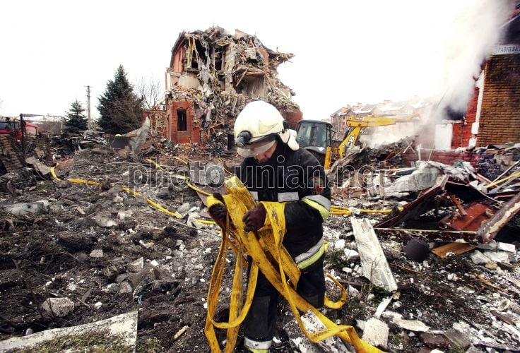 Рятувальник на тлі зруйнованих внаслідок ракетної атаки житлових будинків у с. Софіївська Борщагівка (Бучанський район Київської області, 22 лютого 2026 р. У ніч на 22 лютого російські війська здійснили чергову масовану комбіновану атаку на Україну. Унаслідок російської атаки зафіксовано руйнування та пожежі в Обухівському, Броварському, Бориспільському, Бучанському та Фастівському районах області. Пошкоджень зазнали житлові будинки на Софіївській Борщагівці.