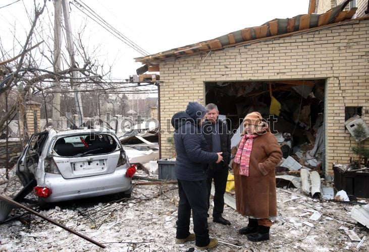 Мешканці у дворі одного з постраждалих сусідніх будинків після ракетної атаки, в с. Софіївська Борщагівка (Бучанський район Київської області), 22 лютого 2026 р. У ніч на 22 лютого російські війська здійснили чергову масовану комбіновану атаку на Україну. Унаслідок російської атаки зафіксовано руйнування та пожежі в Обухівському, Броварському, Бориспільському, Бучанському та Фастівському районах області. Пошкоджень зазнали житлові будинки на Софіївській Борщагівці.
