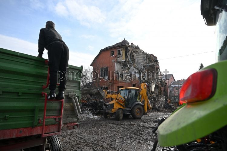 Ліквідація наслідків ракетної атаки в с. Софіївська Борщагівка (Бучанський район Київської області), 22 лютого 2026 р. У ніч на 22 лютого російські війська здійснили чергову масовану комбіновану атаку на Україну. Унаслідок російської атаки зафіксовано руйнування та пожежі в Обухівському, Броварському, Бориспільському, Бучанському та Фастівському районах області. Пошкоджень зазнали житлові будинки на Софіївській Борщагівці. Фото Ратинський В'ячеслав / УНІАН