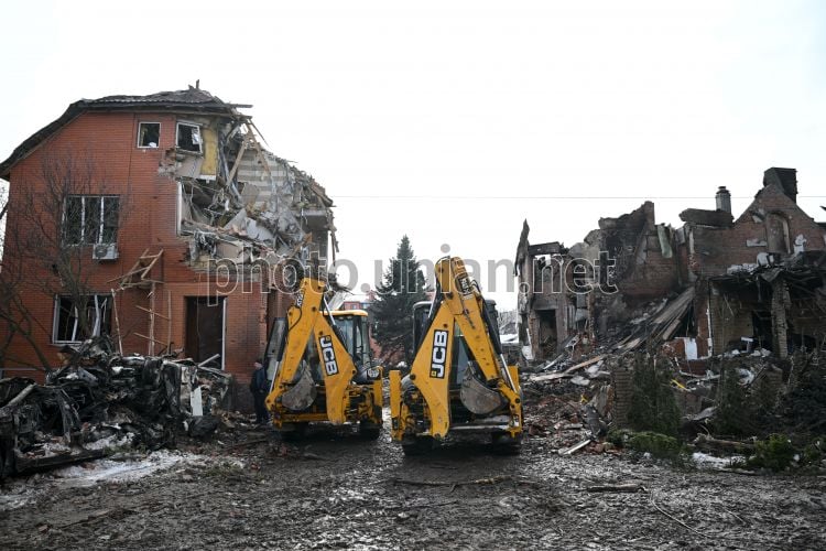 Ліквідація наслідків ракетної атаки в с. Софіївська Борщагівка (Бучанський район Київської області), 22 лютого 2026 р. У ніч на 22 лютого російські війська здійснили чергову масовану комбіновану атаку на Україну. Унаслідок російської атаки зафіксовано руйнування та пожежі в Обухівському, Броварському, Бориспільському, Бучанському та Фастівському районах області. Пошкоджень зазнали житлові будинки на Софіївській Борщагівці. Фото Ратинський В'ячеслав / УНІАН