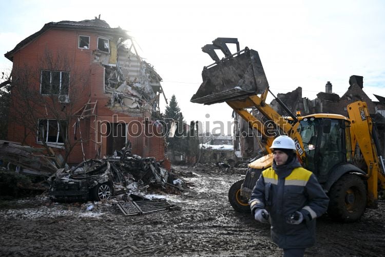 Ліквідація наслідків ракетної атаки в с. Софіївська Борщагівка (Бучанський район Київської області), 22 лютого 2026 р. У ніч на 22 лютого російські війська здійснили чергову масовану комбіновану атаку на Україну. Унаслідок російської атаки зафіксовано руйнування та пожежі в Обухівському, Броварському, Бориспільському, Бучанському та Фастівському районах області. Пошкоджень зазнали житлові будинки на Софіївській Борщагівці. Фото Ратинський В'ячеслав / УНІАН