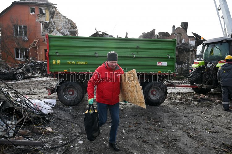 Ліквідація наслідків ракетної атаки в с. Софіївська Борщагівка (Бучанський район Київської області), 22 лютого 2026 р. У ніч на 22 лютого російські війська здійснили чергову масовану комбіновану атаку на Україну. Унаслідок російської атаки зафіксовано руйнування та пожежі в Обухівському, Броварському, Бориспільському, Бучанському та Фастівському районах області. Пошкоджень зазнали житлові будинки на Софіївській Борщагівці. Фото Ратинський В'ячеслав / УНІАН