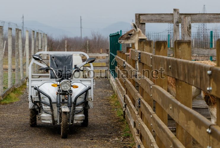 Лама за парканом та мотоцикл на території контактного зоопарку "Ранчо Хайленд" в селі Липча, урочище "Черять", Хустського району (Закарпатська обл.), 22 лютого 2026 р. Фото Немеш Янош / УНІАН