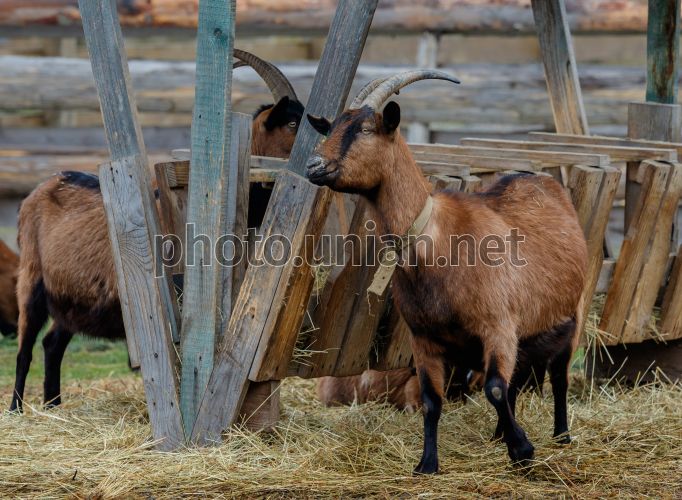 Цапи альпійські їдять на території контактного зоопарку "Ранчо Хайленд" в селі Липча, урочище "Черять", Хустського району (Закарпатська обл.), 22 лютого 2026 р. Фото Немеш Янош / УНІАН