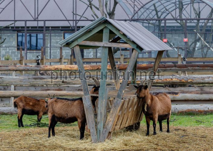 Цапи альпійські їдять на території контактного зоопарку "Ранчо Хайленд" в селі Липча, урочище "Черять", Хустського району (Закарпатська обл.), 22 лютого 2026 р. Фото Немеш Янош / УНІАН