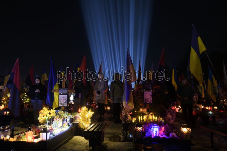 Символічні "Промені пам’яті" над могилами полеглих захисників у Львові, 23 лютого 2026 р. У Львові напередодні четвертої річниці повномасштабного вторгнення рф над могилами полеглих українських Захисників і Захисниць засвітили "Промені пам’яті". Це світло символізує біль, скорботу, пам’ять та вдячність воїнам. Фото Тис Микола / УНІАН