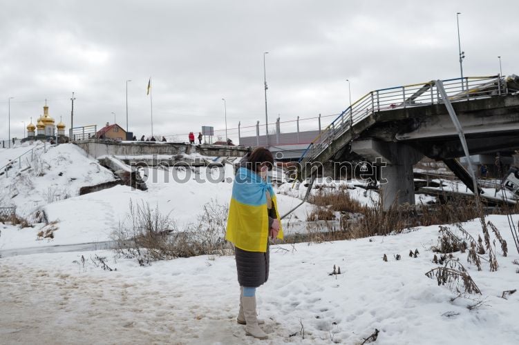 Жінка з прапором України на плечах біля Романівського мосту, так званої «Дороги життя», в Ірпені