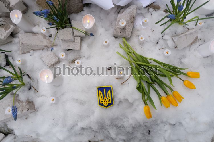 Букет з жовтих тюльпанів та шеврон з гербом України на снігу на міському кладовищі в Бучі, 24 лютого 2026 року.В день 4-ї річниці повномасштабного вторгнення рф люди вшанували пам'ять полеглих захисників України на міському кладовищі в Бучі. Фото Ратинський В'ячеслав / УНІАН