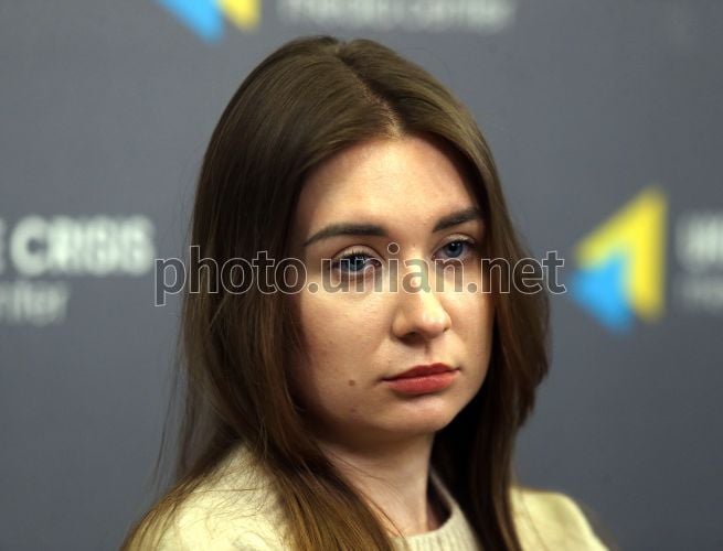 Менеджерка з комунікацій Кримськотатарського Ресурсного Центру Тетяна Савчук під час прес-конференції, присвяченої Дню спротиву окупації Криму, в Києві, 26 лютого 2026 р. Фото Синиця Олександр / УНІАН
