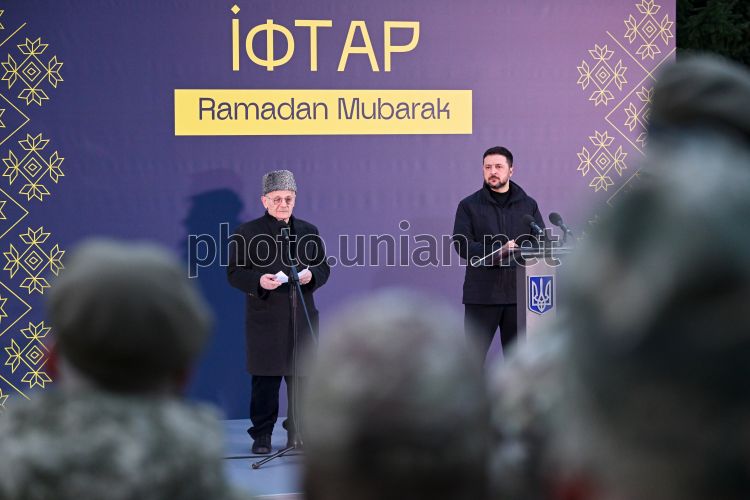 Політичний та громадський діяч України кримськотатарського походження, Герой України, народний депутат Мустафа Джемілєв та президент України Володимир Зеленський під час відвідання Іфтару в Києві, 2 березня 2026 року. Під час відвідання Іфтару (вечеря після заходу сонця під час Рамадану) Володимир Зеленський нагородив захисників-мусульман, які служать у ЗСУ та Національній поліції, орденом князя Ярослава Мудрого V ступеня, орденом Богдана Хмельницького III ступеня, орденом «За мужність» III ступеня, орденом Данила Галицького, медаллю «За військову службу Україні» та медаллю «Захиснику Вітчизни». 18 лютого 2026 року для мусульман розпочався Рамадан 2026, він завершиться 20 березня святкуванням Ураза-байрам. Фото Ратинський В'ячеслав / УНІАН