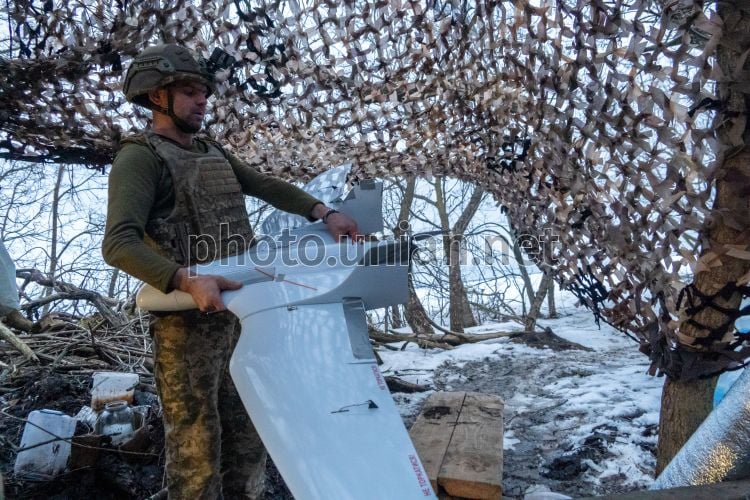 Військовослужбовець аерогрупи 48-ї окремої артилерійської бригади імені полковника Армії УНР Григорія Чижевського (48 ОАБр) готує до запуску беспілотник (БпЛа, дрон) на Харківщині, 4 березня 2026 р. Фото Марієнко Андрій / УНІАН