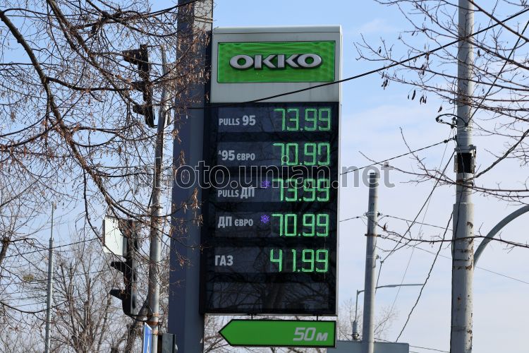 Інформаційне табло з цінами на пальне на АЗС у Києві, 4 березня 2026 р. В Україні на тлі війни на Близькому Сході зросли ціни на пальне. Основними причинами цього є коливання світових цін на нафту, геополітичні ризики і валюта. Дефіциту пального в країні зараз немає, повідомив Комітет з питань енергетики і ЖКГ Верховної Ради. Фото Дмитро Ключко / УНІАН