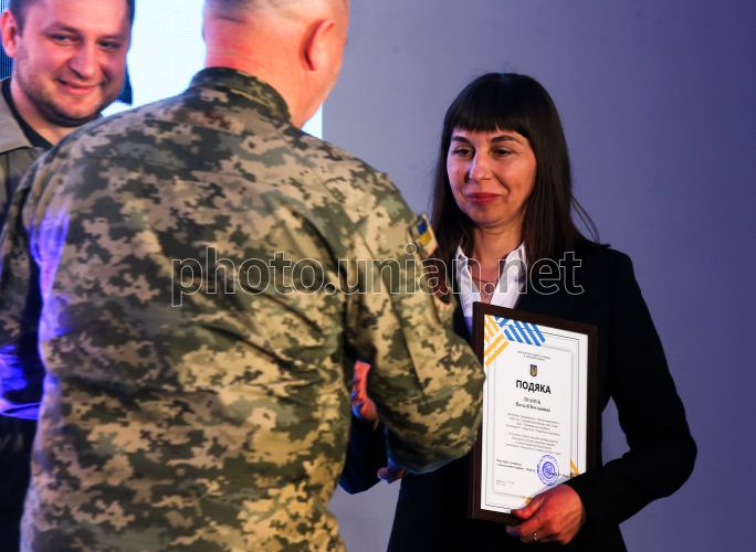 Провідниця медичного вагону Наталя Трачук одержує почесні відзнаки під час презентації медичних вагонів Укрзалізниці, з допомогою яких евакуюють поранених українців, на пероні Центрального залізничного вокзалу, у Києві, 12 березня 2026 року. Сьогодні четверта річниця відтоді, як у рейс вирушили перші медичні вагони, створені Укрзалізницею. Фото Синиця Олександр / УНІАН