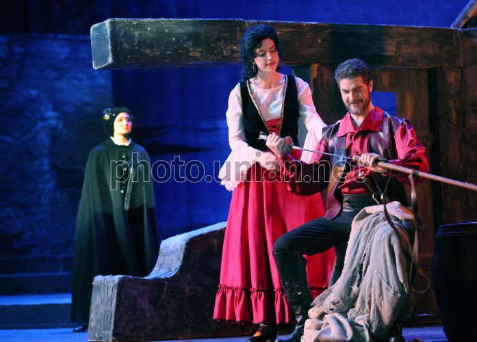 Заслужений артист України Тарас Бережанський (Спарафучілє) і Анастасія Поліщук (Маддалена) під час опери «Ріголетто» Джузеппе Верді у Львівській опері, 20 березня 2026 р. Лібрето Франческо Марії П’яве за мотивами драми Віктора Гюго «Король забавляється». “Ріголетто” Дж. Верді – шедевр італійської опери, який зумів здобути світову славу та став класикою жанру. Виконується італійською мовою з українськими субтитрами. Фото Кравс Євгеній / УНІАН