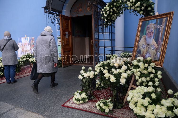 Фото патріарха Філарета біля Свято-Михайлівського собору, де відбувається церемонія прощання з ним, в Києві, 21 березня 2026 р. Патріарх Філарет, який очолював Українську православну церкву Київського патріархату (УПЦ КП), помер 20 березня у віці 97 років. Фото Ковальчук Віктор / УНІАН