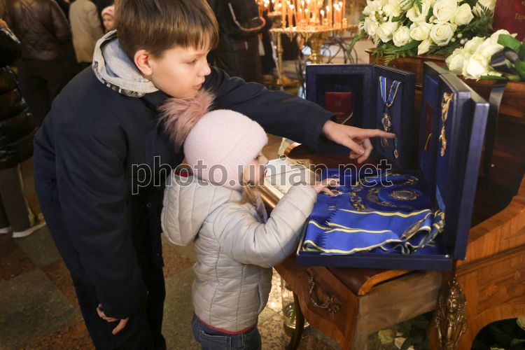 Діти розглядають нагороди патріарха Філарета під час церемонії прощання з ним у Свято-Михайлівському соборі в Києві, 21 березня 2026 р. Патріарх Філарет, який очолював Українську православну церкву Київського патріархату (УПЦ КП), помер 20 березня у віці 97 років. Фото Ковальчук Віктор / УНІАН