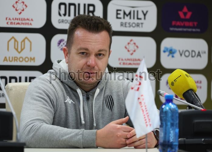 Головний тренер ФК "Рух" (Львів) Іван Федик під час пресконференції після матчу 21-го туру Чемпіонату України серед команд УПЛ (Прем'єр-ліга) з футболу (сезон 2025/26) між ФК «Рух» (Львів) та ФК «ЛНЗ» (Черкаси), у Львові, 21 березня 2026 р. Матч закінчився з рахунком 1:2 на користь ФК "ЛНЗ". Фото Кравс Євгеній / УНІАН