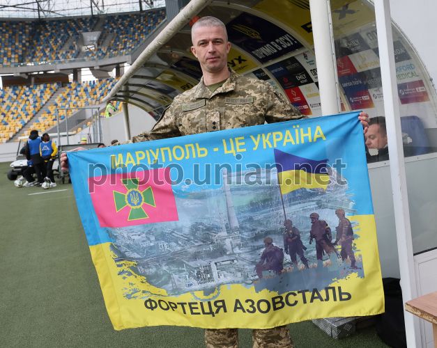 Військовий з прапором перед матчем 21-го туру Чемпіонату України серед команд УПЛ (Прем'єр-ліга) з футболу (сезон 2025/26) між ФК «Рух» (Львів) та ФК «ЛНЗ» (Черкаси), у Львові, 21 березня 2026 р. Матч закінчився з рахунком 1:2 на користь ФК "ЛНЗ". Фото Кравс Євгеній / УНІАН