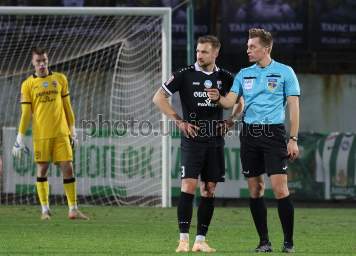 Арбітр Олексій Деревінський під час матчу 21-го туру Чемпіонату України серед команд УПЛ (Прем'єр-ліга) з футболу (сезон 2025/26) між ФК «Карпати» (Львів) та ФК «Оболонь» (Київ), у Львові, 22 березня 2026 р. Матч закінчився з рахунком 4:0 на користь ФК "Карпати". Фото Кравс Євгеній / УНІАН