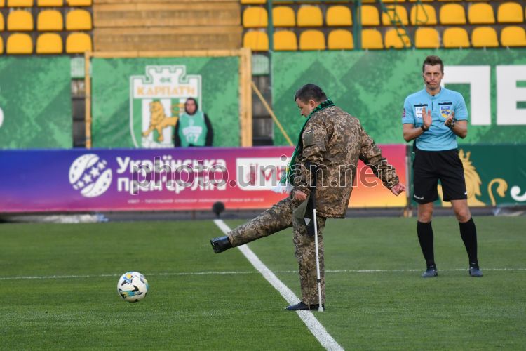 Військовий робить символічний удар по м'ячу під час матчу 21-го туру Чемпіонату України серед команд УПЛ (Прем'єр-ліга) з футболу (сезон 2025/26) між ФК «Карпати» (Львів) та ФК «Оболонь» (Київ), у Львові, 22 березня 2026 р. Матч закінчився з рахунком 4:0 на користь ФК "Карпати". Фото Тис Микола / УНІАН