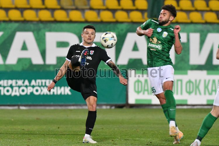 Ігровий момент матчу 21-го туру Чемпіонату України серед команд УПЛ (Прем'єр-ліга) з футболу (сезон 2025/26) між ФК «Карпати» (Львів) та ФК «Оболонь» (Київ), у Львові, 22 березня 2026 р. Матч закінчився з рахунком 4:0 на користь ФК "Карпати". Фото Тис Микола / УНІАН