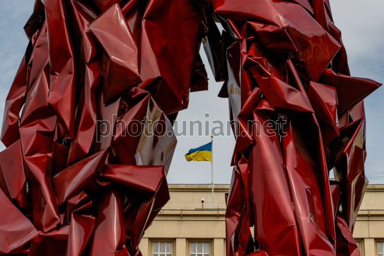 Монументальна інсталяція українського художника Михайла Деяка "Реконструкція подій" під час презентації, в Ужгороді, 27 березня 2026 р. Фото Немеш Янош / УНІАН