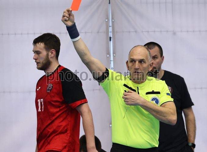 Ігровий момент матчу Чемпіонату України з гандболу (Чоловіки. Суперліга. 11 тур) між ГК «Спартак» (Київ) та ГК «Хмельницький», у Львові, 27 березня 2026 р. Матч закінчився з рахунком 43:37 на користь киян. Фото Кравс Євгеній / УНІАН