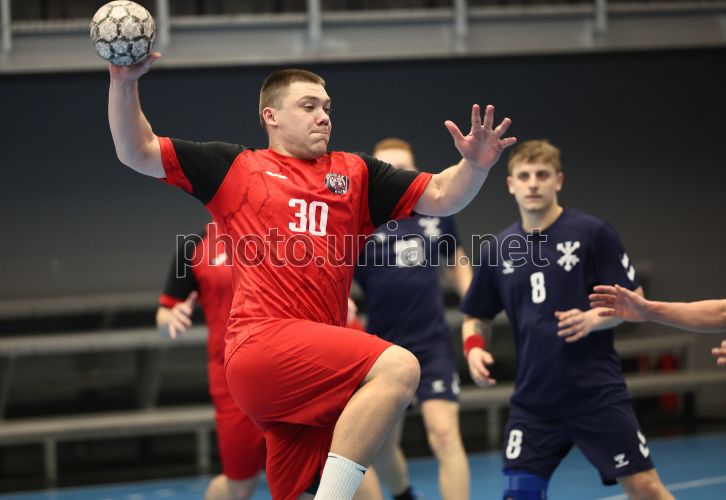 Ігровий момент матчу Чемпіонату України з гандболу (Чоловіки. Суперліга. 11 тур) між ГК «Спартак» (Київ) та ГК «Хмельницький», у Львові, 27 березня 2026 р. Матч закінчився з рахунком 43:37 на користь киян. Фото Кравс Євгеній / УНІАН