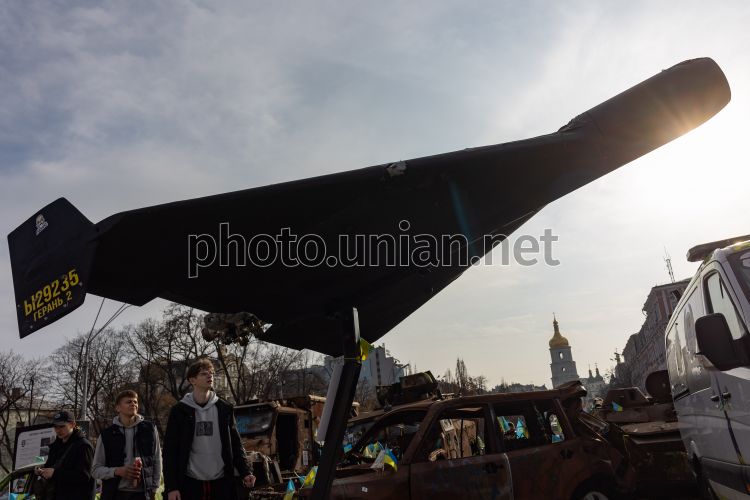 Дрон "Герань-2" на виставці знищеної російської військової техніки на Михайлівській площі у Києві, 29 березня 2026 р. Фото УНІАН