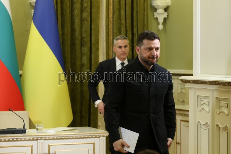 Президент України Володимир Зеленський та виконувач обов'язків прем'єр-міністра Болгарії Андрей Гюров перед початком спільної пресконференції, у Києві, 30 березня 2026 р. Фото Ковальчук Віктор / УНІАН