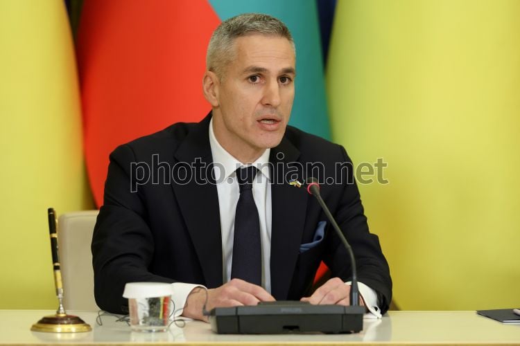 Виконувач обов'язків прем'єр-міністра Болгарії Андрей Гюров під час спільної пресконференції з президентом України Володимиром Зеленським, у Києві, 30 березня 2026 р. Фото Ковальчук Віктор / УНІАН
