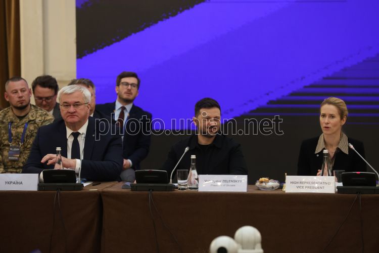 Міністр закордонних справ України Андрій Сибіга, президент України Володимир Зеленський та Висока представниця Європейського Союзу з питань закордонних справ і політики безпеки Кая Каллас під час виїзного неформального засідання Ради ЄС у закордонних справах (FAC) в Києві, 31 березня 2026 р. Фото Ковальчук Віктор / УНІАН
