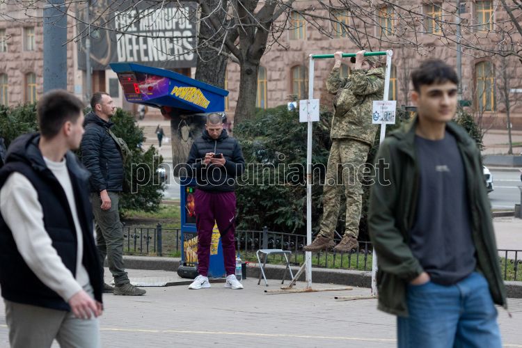 Військовослужбовець на турніку-атракціоні на Хрещатику, в Києві, 2 квіня 2026 р. Фото УНІАН