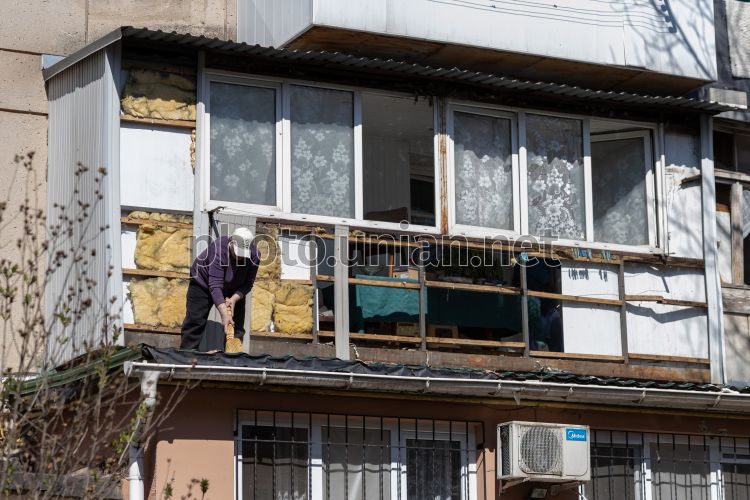 Чоловік прибирає сміття біля пошкодженого внаслідок ворожого удару балкона житлового будинку в Одесі, 5 квітня 2026 р. Внаслідок нічної дронової атаки пошкоджено житлові будинки в Хаджибейському районі міста. Постраждали троє людей. Фото Гіманов Олександр / УНІАН