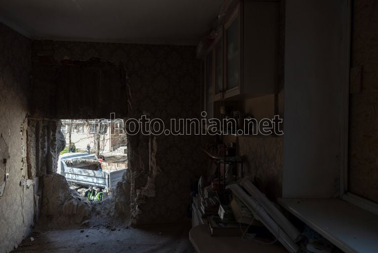 Вид на вулицю через дірку у пошкодженому від ворожої атаки фасаді житлового будинку в Одесі, 5 квітня 2026 р. Внаслідок нічної дронової атаки пошкоджено житлові будинки в Хаджибейському районі міста. Постраждали троє людей. Фото Гіманов Олександр / УНІАН
