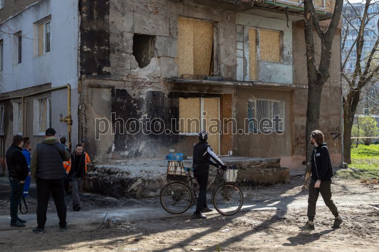 Пошкоджений фасад, вибиті вікна та зруйновані балкони в житловому будинку, що постраждав від ворожої атаки. в Одесі, 5 квітня 2026 р. Внаслідок нічної дронової атаки пошкоджено житлові будинки в Хаджибейському районі міста. Постраждали троє людей. Фото Гіманов Олександр / УНІАН