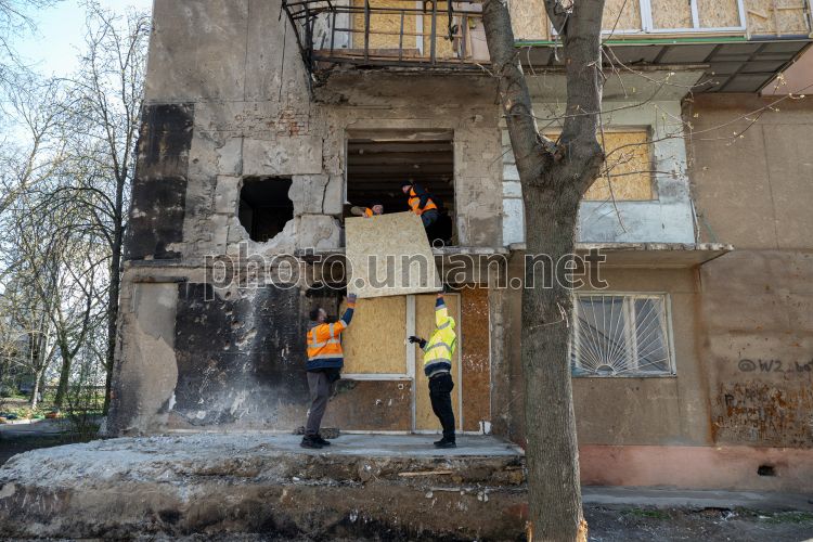 Працівники комунальної служби закривають вибиті вікна фанерою у пошкодженому від ворожої атаки житловому будинку в Одесі, 5 квітня 2026 р. Внаслідок нічної дронової атаки пошкоджено житлові будинки в Хаджибейському районі міста. Постраждали троє людей. Фото Гіманов Олександр / УНІАН